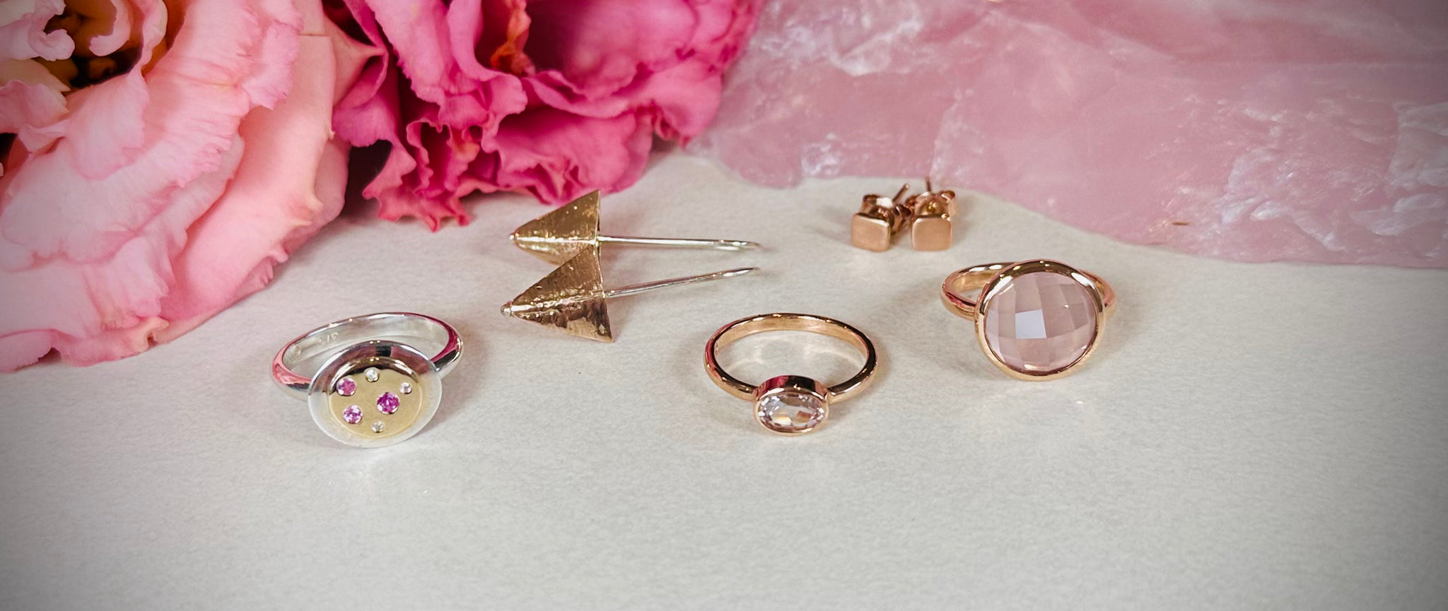 Eve ring set with a natural rose quartz. Can be ordered in rose gold or yellow gold, 9ct or 18ct gold. A very attractive combination and popular style.