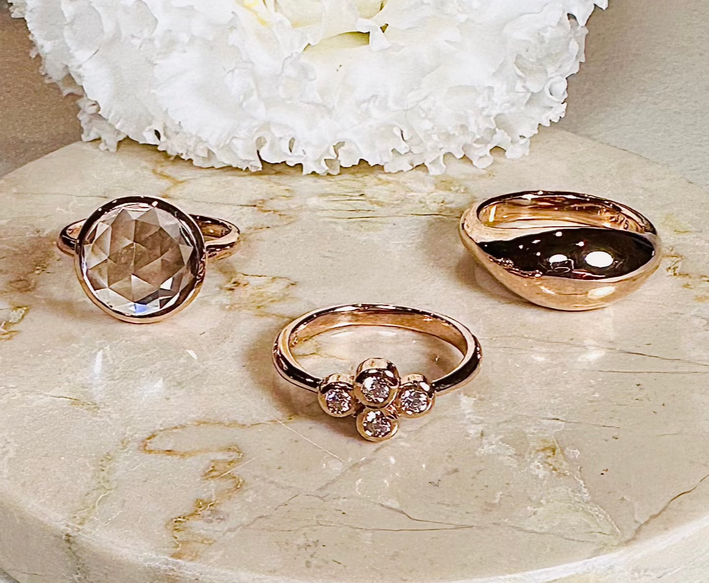 Eve ring set with a natural clear quartz. Can be ordered in rose gold or yellow gold, 9ct or 18ct gold. A very attractive combination and popular style.