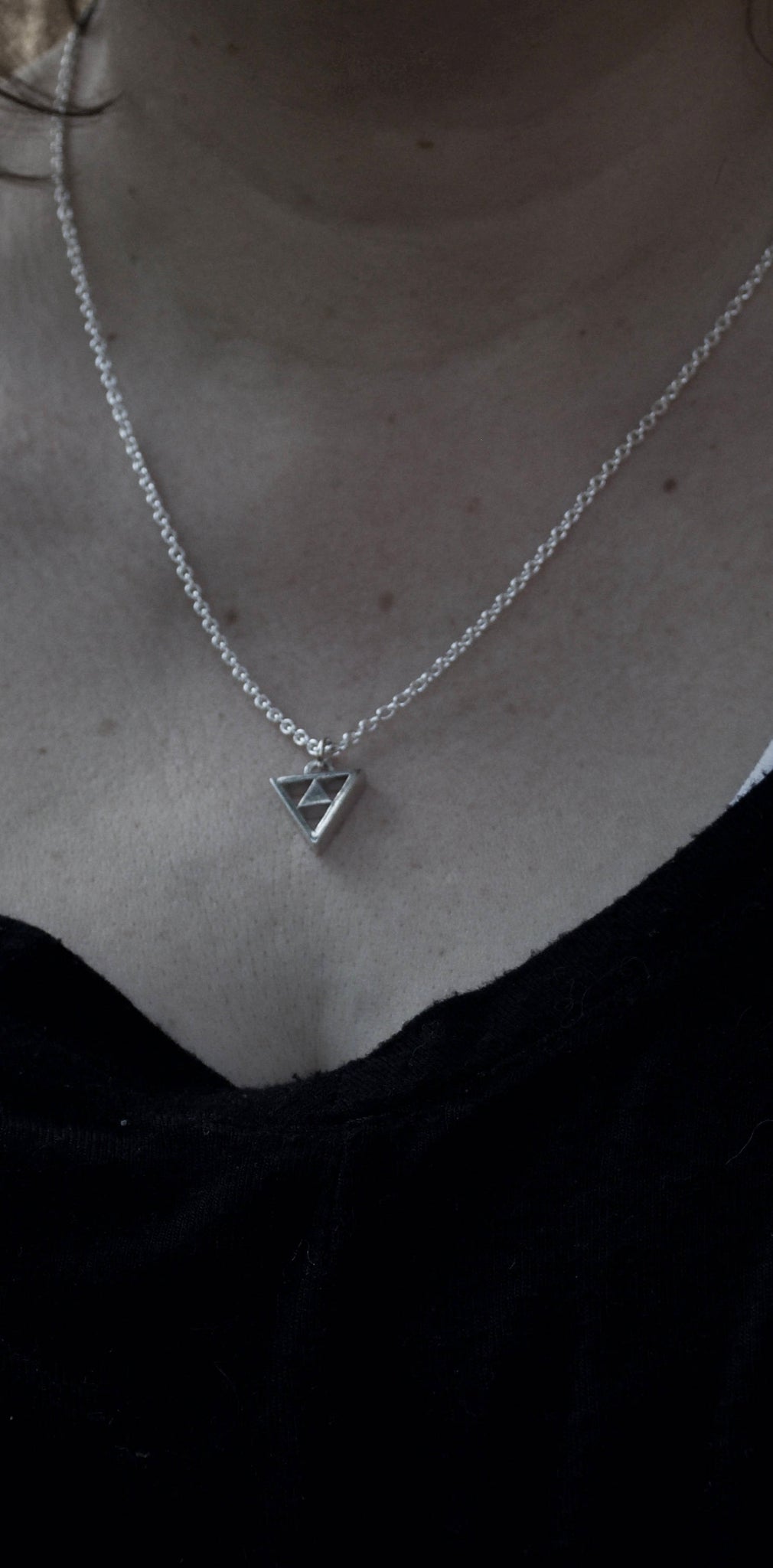 Handcrafted natural Solid Sterling Silver necklace, called the "Triangle Necklace". It is part of my Triangle Range. It is handmade in solid sterling silver 925. In the pictures it has been finished with a high polished silver. It can also be made in a satin (matt) silver finish. So easy to wear and co-ordinate with other jewellery items.