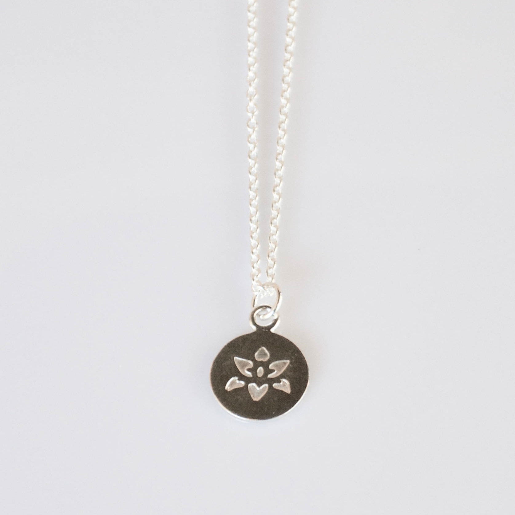 Handcrafted natural Solid Sterling Silver necklace called the "Round Flower Pendant". It is handmade in solid sterling silver 925. This pendant is a 14mm sterling silver disc stamped with a flower design. It hangs on a 45cm sterling silver chain. In the pictures it has been finished with a high polished silver and the stamped flower is not oxidised. The flower design can be oxidised if selected. This is a very sweet necklace, easy to wear anytime.